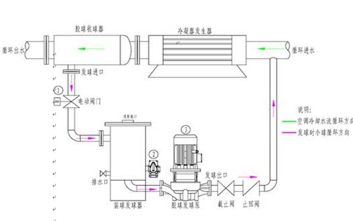 膠球清洗--膠球清洗裝置---凝汽器膠球清洗裝置選用合適的膠球,將膠球從裝球室手孔處投入裝球室內(nèi),投球數(shù)量為主機(jī)冷卻水管數(shù)的10%左右。先打開收球網(wǎng)的球閥,然后啟動(dòng)膠球泵,關(guān)閉放水閥,再打開裝球室上的排氣閥,排完裝球室內(nèi)的空氣,關(guān)閉排氣閥,再打開送球管道中間的球閥,當(dāng)水流正常運(yùn)行時(shí)慢慢打開裝球室的切換閥,不宜過猛的切換,過猛切換會(huì)導(dǎo)致收球網(wǎng)堵球。膠球在循環(huán)水流帶動(dòng)下進(jìn)入凝汽器水室。膠球在循環(huán)水進(jìn)出口壓力差的作用下跳動(dòng)洗刷冷卻管內(nèi)泥沙污物,對(duì)冷卻管內(nèi)進(jìn)行一次抹擦,使冷卻管內(nèi)壁泥沙污垢隨著水流帶出,膠球經(jīng)循環(huán)水的帶動(dòng)下進(jìn)入收球網(wǎng),收球網(wǎng)將膠球分離出來,由膠球泵將膠球重新吸入裝球室,按此規(guī)律往復(fù)循環(huán)對(duì)中央空調(diào)主機(jī)冷卻水管進(jìn)行連續(xù)清洗,運(yùn)行時(shí)間一般為40分鐘 。