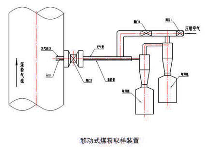 新型煤粉取樣器的工作原理如下:首先將安裝在固定座上并緊靠一次風(fēng)管的隔離閥門打開,固定式新型煤粉取樣裝置通過轉(zhuǎn)動進退傳動裝置的手柄(移動式新型煤粉取樣裝置則通過人工),將連為一體的取樣管和乏氣排放管伸入一次管內(nèi)的取樣位置,打開壓縮空氣閥門,壓縮空氣流經(jīng)文丘里抽氣器時產(chǎn)生負壓,將一次風(fēng)管中的空氣和煤粉混合物,通過取樣管被吸入旋風(fēng)式的煤粉分離器,進行氣、粉分離,分離下來的煤粉顆粒落入取樣罐中,乏氣經(jīng)抽氣器引射管和乏氣排放管返回一次風(fēng)管。每次取樣時間大約3-5分鐘。最后在實驗室中對所取得樣本稱重篩選,以確定煤粉顆粒細度。