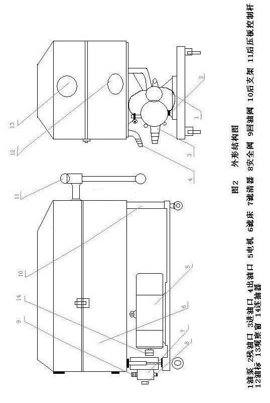 此機(jī)是由齒輪泵、濾清器、安全閥、回油閥、濾床、壓力表、濾板、濾框、濾油紙、油盤(pán)、前支架、后支架、底盤(pán)、聯(lián)軸器、以及電動(dòng)機(jī)等部件組成。