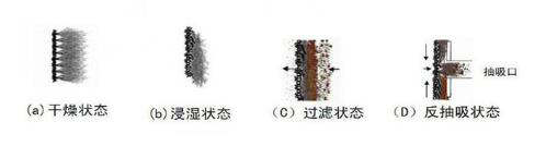 濾布結構為大孔隙支撐層及纖維毛層,反抽吸時,在反抽吸口處纖維毛會完全直立起來,清洗比較徹底,殘留很難積累。